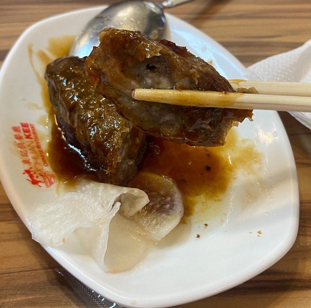 As soon as Chuan Kee opened, we hurried back to find early diners already. We ordered their Kikiam, Soup No. 5, and Chicken with Cucumber Xiao Long Bao (the green one). The kikiam came with s few slices of pickled radish and a sweet, slightly sticky sauce, but tasted fine even without it.